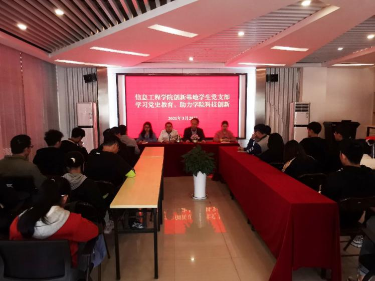 创新基地学生党支部3月28号下午在逸夫楼负一楼创新创业会议室召开“党史学习教育,促进学院科技创新”会议活动,院党委副书记何仲坚、创新基地学生党支部书记黄德昌和创新基地学生党支部全体学生党员参加会议。