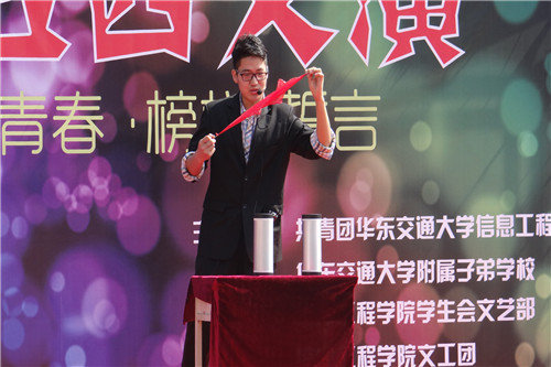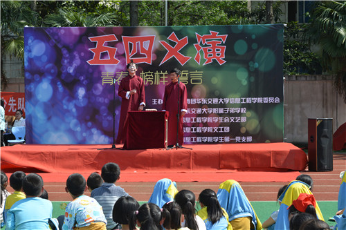 为弘扬五四先驱们所倡导的“爱国、进步、民主、科学”的五四爱国精神,发扬“以社会为己任,敢为天下先”的优良传统。4月28日,信息学子于交大子弟学校田径场倾情奉献主题为“青春•榜样•誓言”的五四义演活动,为建校45周年华诞献礼添彩。