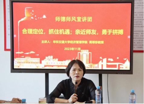蒋翠珍教授结合自身的经历分享了从教三十余年的心得和师德师风心路历程。她强调,教师是光荣而神圣的职业,要以高度的责任感和事业心,怀揣满腔的热情投入到工作中,不断更新和拓宽自己的知识领域,学习创新教育教学方法,勇于拼搏,敢于挑战,才能不断突破自我,取得优异成绩。她也是始终如一严格要求自己,先后荣获了高校教学成果奖一等奖、江西省教育科学优秀成果二等奖等荣誉。她还指出,要亲近师友,同事间的相互帮助定能促进相互成就,并分享自己做精品课程的经历,进一步阐述了帮助他人亦会成就自己的道理。