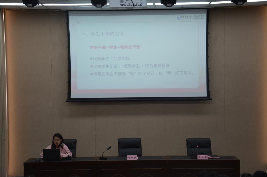 会上,谭莉以如何成为一名优秀的学生骨干为主题进行交流分享,主要围绕如何正确处理学习与工作的平衡和如何正确对待干部职位的态度两个问题进行发言。她提到,学生干部应当通过培养自身政治上、能力上、团队上的素质,更好地平衡学习与工作之间的关系,还应当端正态度,做到在工作中积累经验,培养自己独立处理事情的能力,成为做事高效、对事有主见、对不足有思考的优秀学生干部。