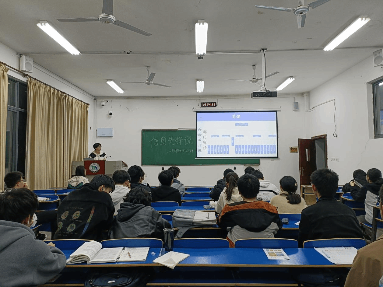 本次信息先锋说活动,董嘉乐同志首先围绕学习的三个基本要素点—学习本质、学习方法和最终目标来进行各方面经验的分享。他将学习类比为射箭,当一个射击运动员想要在赛场上命中靶心的话,那么他的瞄准能力、射箭的角度、力度和准度以及对箭靶的认识都会影响到这位选手的最终得分,学习亦是如此。对此,他表示:在学习理论知识感到枯燥的时候,可以自己尝试去设计一块PCB、设计一款小游戏、开发一个APP,以练带学,以项目实践驱动理论学习,从而更好的激发出学习的乐趣。随后,对于23级的同学对大学生涯提出问题,他详细解答英语四六级、大学物理实验、推优入党等各方面的疑惑。