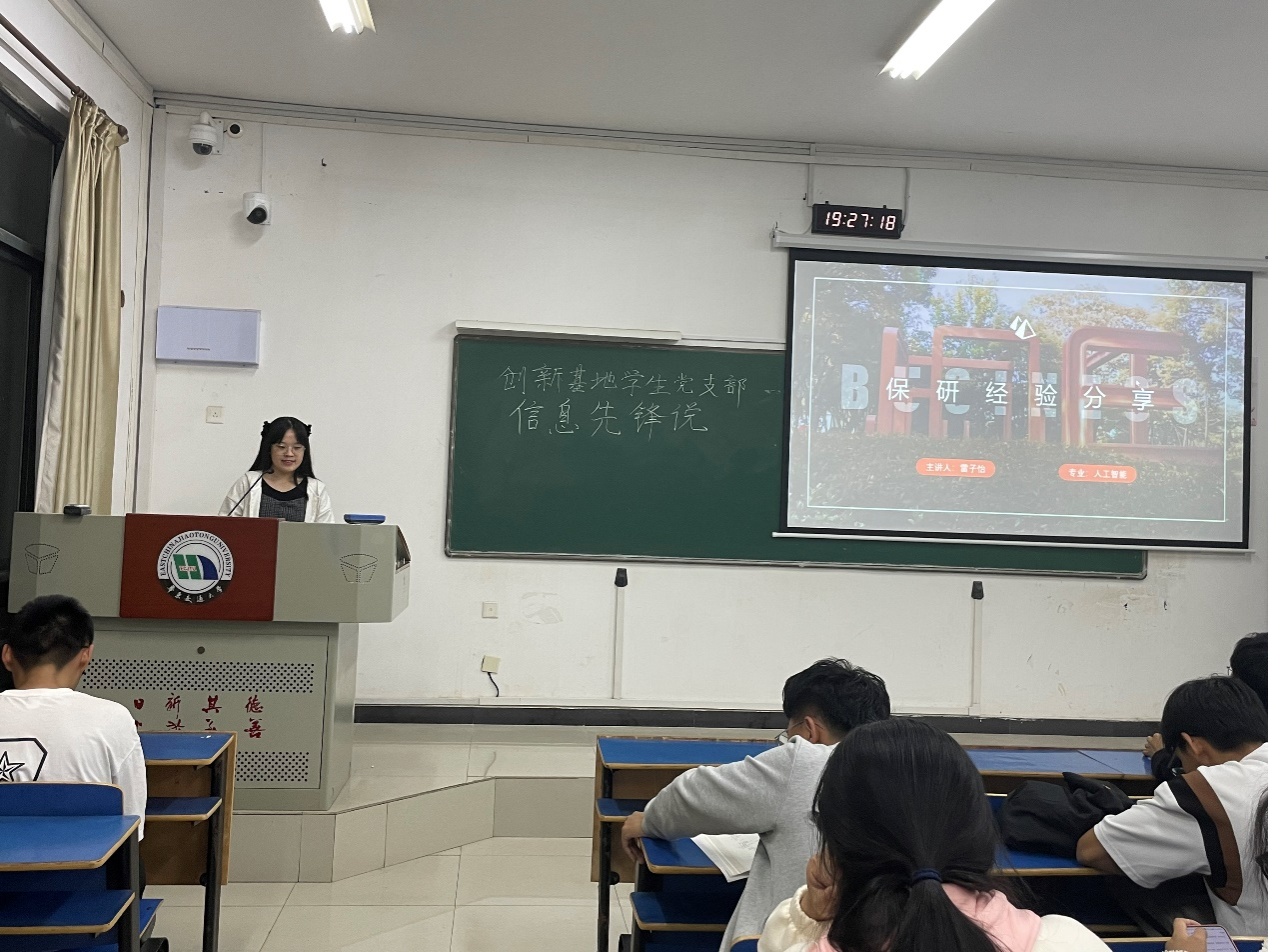 举办“信息先锋说”第十四期分享会。此次会议由创新基地学生党支部组织并承办。支部成员雷子怡同志成功推免至厦门大学,因此她以保研经验为主题作分享交流。计算机2023-4、6班、通信工程2022-3、4班同学参加分享会。